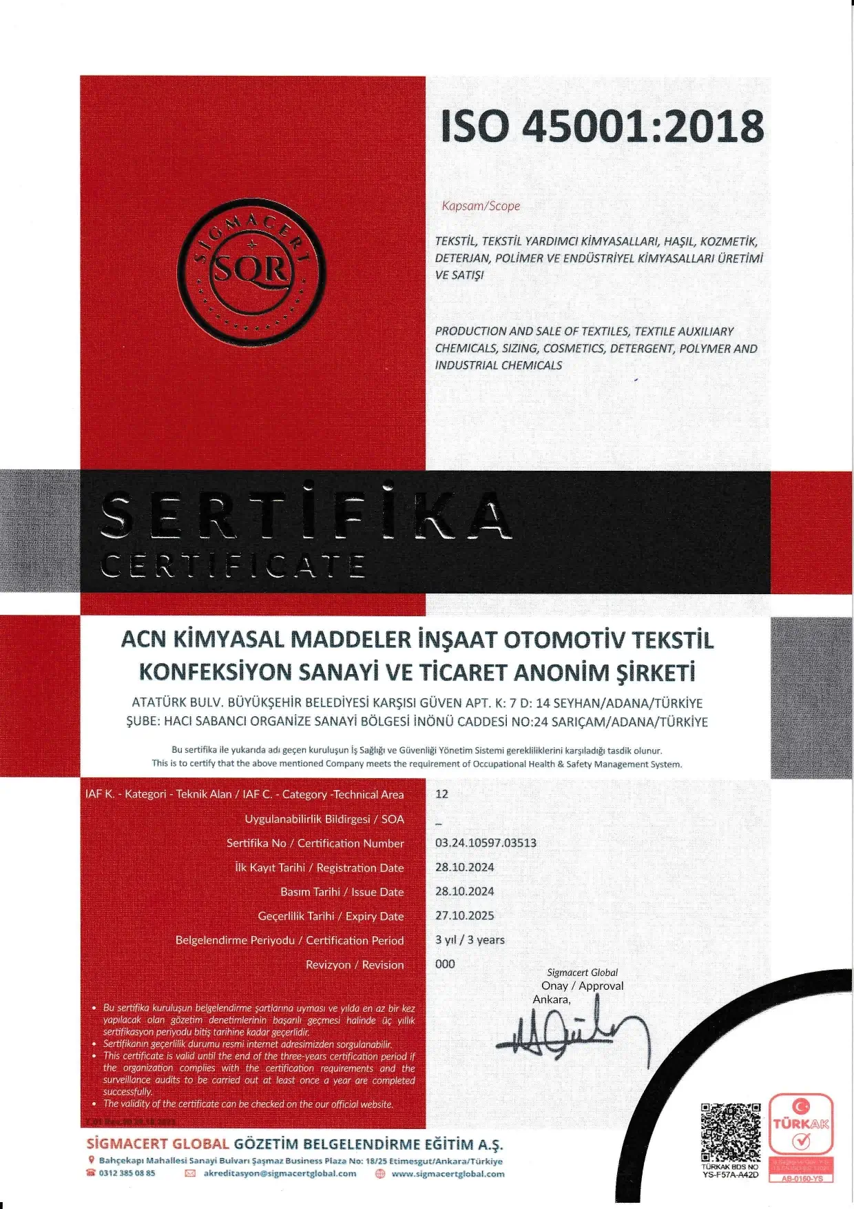 ACN Kimya olarak uluslararası standartlara uygun üretim süreçlerimizin kanıtı olan sertifikalarımız